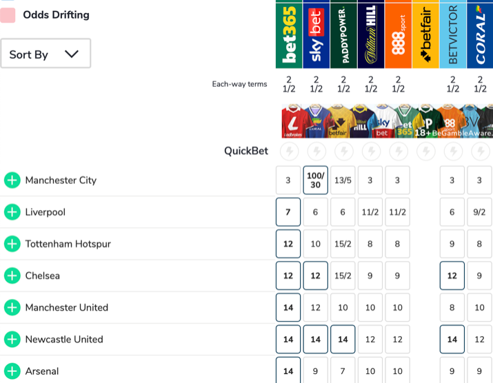 ส่วนทีมอื่นที่น่าสนใจคือ สเปอร์ส เต็งสาม เรต 8/1, เชลซี เต็งสี่ เรต 9/1 และ แมนฯ ยูไนเต็ด, อาร์เซน่อล เต็งห้าร่วม เรต 10/1