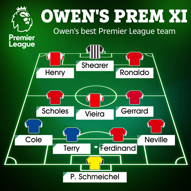 ในระบบ 4-3-3 ตำแหน่งผู้รักษาประตู โอเว่น เลือก ปีเตอร์ ชไมเคิ่ล ตำนานของ แมนเชสเตอร์ ยูไนเต็ด โดยกองหลังมี แกรี่ เนวิลล์, ริโอ เฟอร์ดินานด์, จอห์น เทอร์รี่ และ แอชลี่ย์ โคล ซึ่งเป็นชาวอังกฤษทั้งหมด