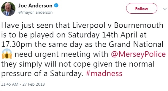 โจ แอนเดอร์สัน นายกเทศมนตรีเมือง ลิเวอร์พูล ออกโรงจวกฝ่ายจัดการแข่งขัน ที่วางคิวเตะไม่ดูตาม้า ตาเรือ จับให้เกมเหย้าของ 'หงส์แดง' เตะตรงกับวันแข่งม้ารายการใหญ่สุดประเทศซึ่งจัดขึ้นในเมอร์ซี่ย์ไซด์ จนอาจเกิดปัญหาเรื่องจำนวนเจ้าหน้าที่ตำรวจไม่พอดูแลความเรียบร้อย