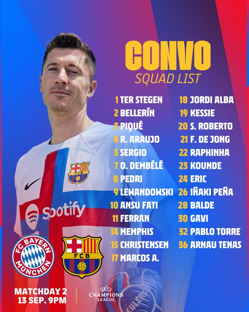 รายชื่อนักเตะบาร์เซโลน่าชุดเยือน บาเยิร์น มิวนิค มีดังนี้
