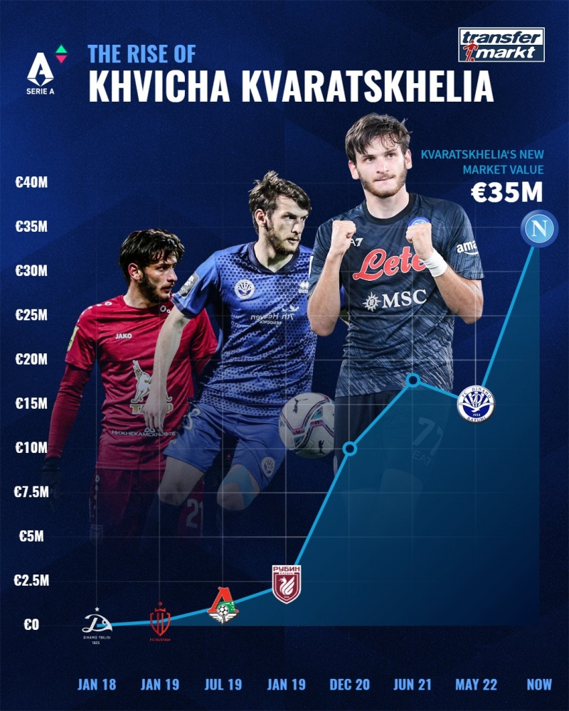 ควิช่า ควารัตส์เคเลีย ปีกทีมชาติจอร์เจีย มีมูลค่าทางการตลาดเพิ่มขึ้นเกินสองเท่าหลังโชว์ฟอร์มเด่นกับ นาโปลี นับตั้งแต่ย้ายมาร่วมทีม