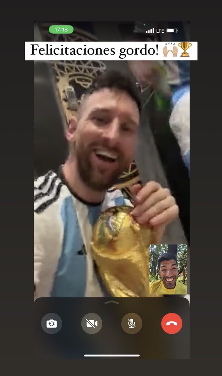 เมสซี่ โทรหา หลุยส์ ซัวเรซ ทางเฟซไทม์ ก่อนกองหน้าทีมชาติอุรุกวัยจะแคปหน้าจอโพสต์ลงอินสตาแกรมพร้อมแคปชั่นว่า 'ยินดีด้วยไอ้อ้วน'