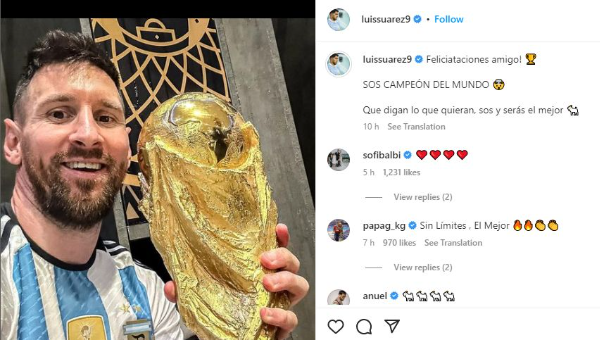 หลุยส์ ซัวเรซ ยังโพสต์ข้อความร่วมยินดีกับความสำเร็จของ เมสซี่ เพิ่มเติมว่า 'ยินดีด้วยเพื่อน คุณคือแชมป์โลก'