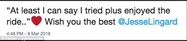 "อย่างน้อยฉันก็สามารถพูดได้ว่าพยายามอย่างที่สุดแล้ว ขอให้นายโชคดีนะ @JesseLingard" ทั้งนี้ในเวลาต่อมาโพสต์ก็ถูกลบ