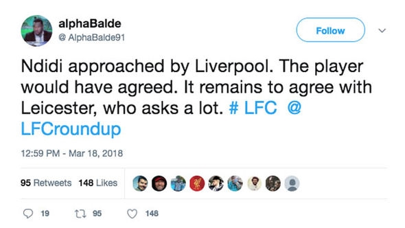 ล่าสุดนักข่าวแอฟริกันก็ทวีตผ่านบัญชี @AlphaBalde91 ว่า "เอ็นดิดี้ โดน ลิเวอร์พูล งาบแล้ว นักเตะก็ตกปากรับคำ ที่เหลือก็ขึ้นกับ เลสเตอร์ ว่าจะเรียกร้องเอามากน้อยแค่ไหน #LFC"