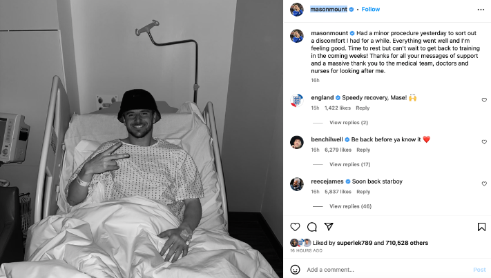 “ผ่าตัดเล็กไปวานนี้ เพื่อสะสางอาการซึ่งทำให้ไม่สบายตัวมาพักใหญ่” บัญชี @masonmount โพสต์ภาพจากในโรงพยาบาล