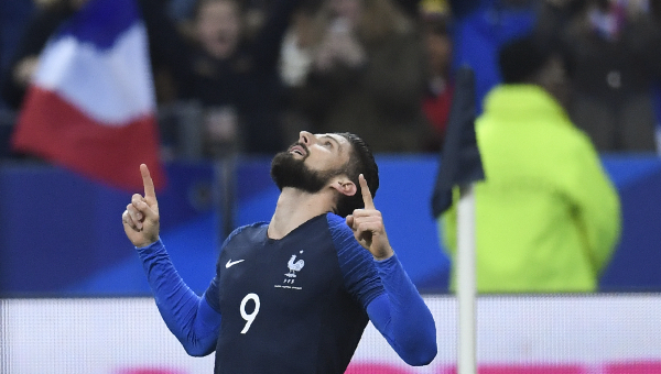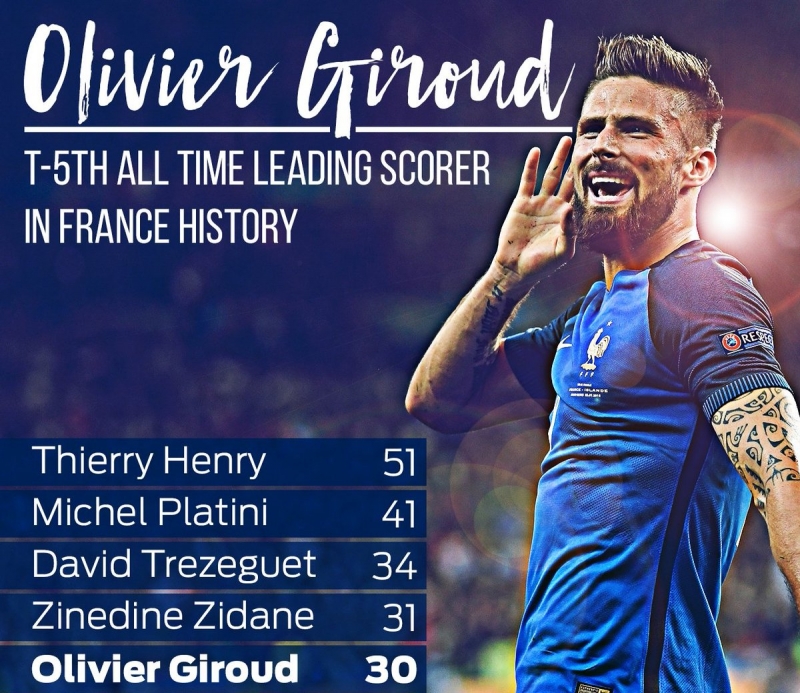 โอลิวิเย่ร์ ชิรูด์ กองหน้าเชลซี ยิงประตูในนามทีมชาติฝรั่งเศสทาบสถิติของ ชุสต์ ฟงแตน และ ฌอง-ปิแอร์ ปาแป็ง ได้สำเร็จหลังกดลูกที่ 30 ในเกมอุ่นเครื่องกับโคลอมเบีย