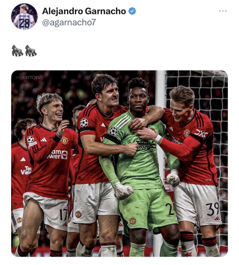 หลังจบเกม การ์นาโช่ ร่วมฉลองชัยชนะด้วยการโพสต์ภาพตัวเองและนักเตะปีศาจแดงเข้ามาไปรุมดีใจกับ โอนาน่า พร้อมกับมีอิโมจิ "กอร์ริลล่า" สองตัวประกอบรูปแบบแทนข้อความ