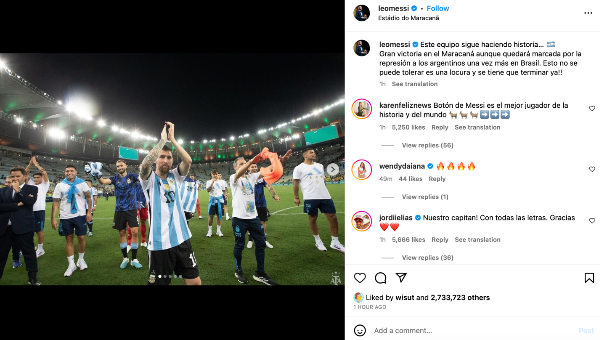 จากนั้น เมสซี่ ก็ออกจากสนามแบบไม่ให้สัมภาษณ์สื่อฯเพิ่ม แต่ไปโพสต์อินสตาแกรมเนื้อหาเรื่องการใช้ความรุนแรงหยุดแฟนบอลอาร์เจนไตน์อีกครั้งโดยฝ่ายจัดบราซิเลียน เป็นเรื่องที่รับไม่ได้