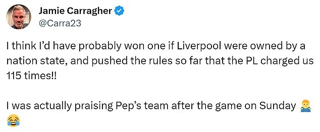 แน่นอนพอความเห็น เป๊ป ออกมา ทาง คาร์ราเกอร์ ก็ทวีตโตผ่าน @Carra23 แดกดันจุดอ่อนของ ซิตี้ เรื่องไฟแนนเชี่ยลแฟร์เพลย์