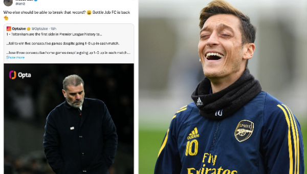 "OptaJoe" ที่เก็บข้อมูลสถิติรายงานผ่านแพลตฟอร์ม "เอ็กซ์" หรือ ทวิตเตอร์ ว่า "ท็อตแน่ม เป็นสโมสรแรกในประวัติศาสตร์พรีเมียร์ที่ไม่สามารถเอาชนะคู่แข่งได้ 5 นัดติด แม้ขึ้นนำก่อน 1-0 และยังแพ้ 3 นัดติดในบ้านจากการนำก่อน 1-0 ในทุกนัดด้วย"