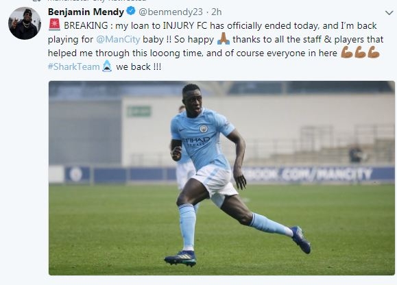 อดีตแข้งโมนาโกที่เคาะสนิมไป 45 นาที ทวีตหลังเกมว่า "การยืมตัวของผมให้กับ 'อาการบาดเจ็บ' สิ้นสุดอย่างเป็นทางการแล้วในวันนี้ ผมกลับมาเล่นให้ทีมเด็กแมนฯ ซิตี้ แฮปปี้นะ ขอบคุณสตาฟฟ์โค้ชทุกคนที่ช่วยผมผ่านช่วงเวลาอันยาวนาน และแน่นอนทุกคนที่นี่" #SharkTeam เรากลับมา !!!