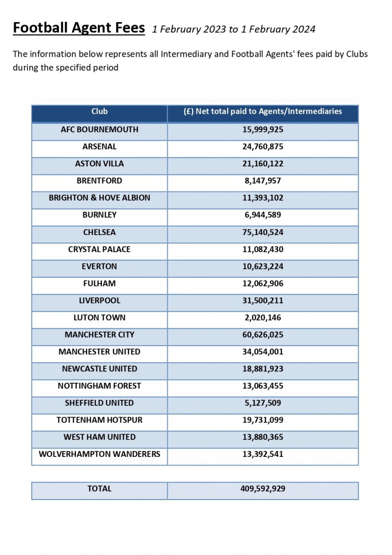 เชลซี ใช้เงินรวมมากถึง 75.1 ล้านปอนด์ สำหรับค่าเอเยนต์และตัวกลางในการซื้อขายนักเตะตลอดฤดูกาล 2023/24 จากการเปิดเผยของสมาคมฟุตบอลอังกฤษ หรือ เอฟเอ