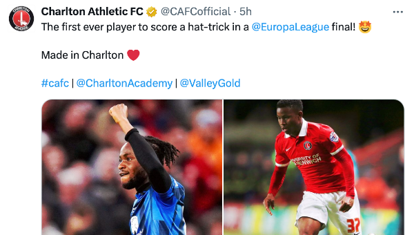“ผู้เล่นคนแรกที่ทำแฮตทริกนัดชิงฯ ยูโรปา ลีก - ผลิตขึ้นที่ ชาร์ลตัน” ทวีตจากบัญชีเอ็กซ์ @CAFCofficial
