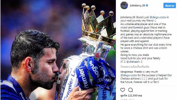 จอห์น เทอร์รี่ อดีตกัปตันทีม เชลซี อัพรูปลงอินสตาแกรมส่วนตัว @johnterry.26 อวยพรให้ ดีเอโก้ คอสต้า กองหน้าเลือดร้อนโชคดีกับสโมสร แอต.มาดริด หลังสามารถบรรลุข้อตกลงย้ายไปร่วมทัพได้แล้ว