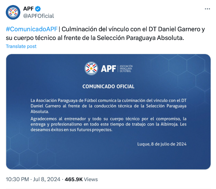 แถลงการณ์จากสมาคมฟุตบอลปารากวัย (เอพีเอฟ) ว่าฝ่ายบริหารผิดหวังผลงานของ ‘ลา อัลบีร์โรฮา’ ในการเล่น 3 นัดรอบแบ่งกลุ่มที่สหรัฐฯอย่างมาก เพราะแพ้รวดต่อ โคลอมเบีย 1-2, แพ้ บราซิล 1-4 และ แพ้คอสตาริกา 1-2 จมบ๊วยกลุ่ม