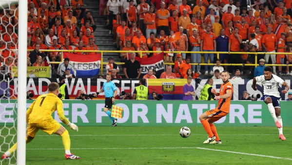 เล่นได้เพียง 6 นาทีเศษ เนเธอร์แลนด์ ออกนำ 1-0 ชาวี ซีมอนส์ ตัดบอลจาก เดแคลน ไรซ์ ก่อนลากจี้แล้วได้ช่องกดเต็มเท้าจากนอกกรอบเขตโทษส่งบอลพุ่งแหวกอากาศผ่านมือ จอร์แดน พิคฟอร์ด เสียบตาข่าย
