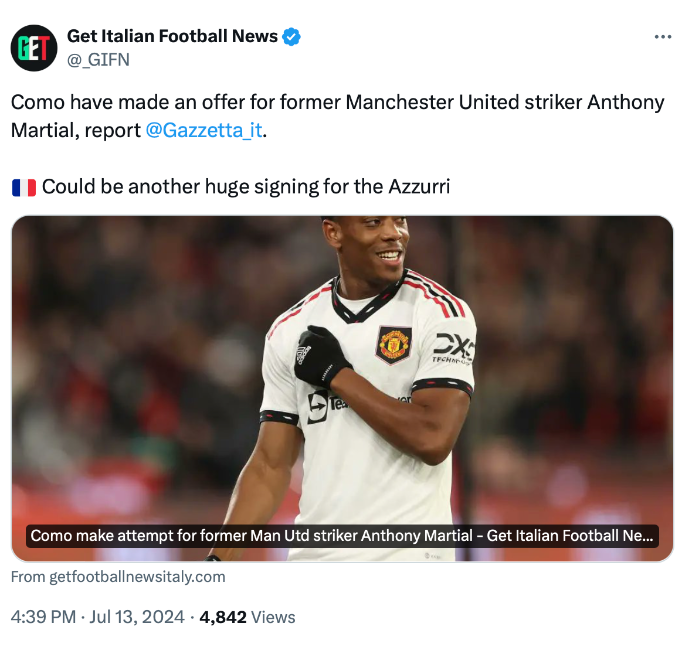 สโมสร โคโม่ น้องใหม่แห่งเซเรีย อา อิตาลี อยากมีสถานะเป็นศูนย์รวมบรรดาแข้งชื่อดังตกอับ ล่าสุดปั้นข้อเสนอทาบทามกองหน้าฟรีเอเยนต์ อ็องโตนี่ มาร์กซิยาล เพิ่มอีกราย