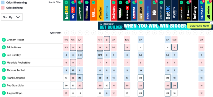 โดย พ็อตเตอร์ ถูกมองว่ามีโอกาสรับไม้ผลัดมากสุดเรต 6/5 (แทง 5 จ่าย 6 ไม่รวมทุน) ฐานะคนอังกฤษ, วัยวุฒิ 49 ปีมีทั้งประสบการณ์ ผสานความทะเยอทะยาน, ไอเดียฟุตบอลหัวก้าวหน้า และว่างงานนับจากถูก เชลซี ปลดเมื่อปี 2023