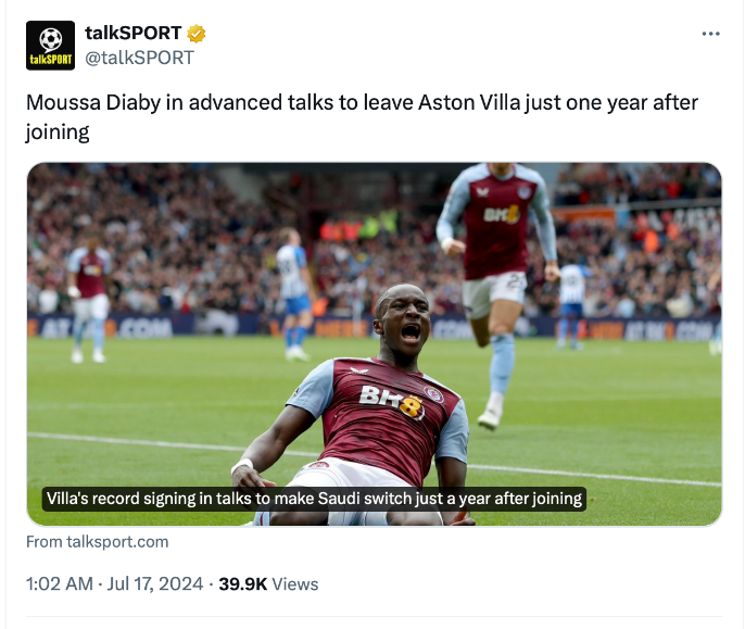 สโมสร แอสตัน วิลล่า ยินดีทำธุรกิจกับ อัล-อิตติฮัด แห่งซาอุดี โปร ลีก ซึ่งเล็งคว้าปีก มูสซ่า ดิยาบี้ ไปร่วมงาน ขอแค่กล้าจ่ายค่าตัว 60 ล้านปอนด์