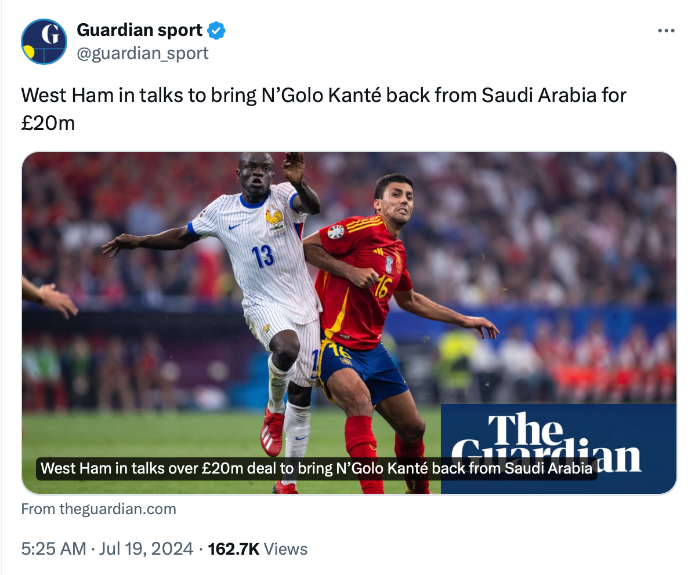 สโมสร เวสต์แฮม ยูไนเต็ด แสดงความสนใจคว้าตัว เอ็นโกโล่ ก็องเต้ อดีตกองกลาง เชลซี กลับมาเล่นยังพรีเมียร์ลีก อังกฤษ อีกครั้ง หลังแสดงศักยภาพโดดเด่นระหว่างทัวร์นาเมนต์ ยูโร 2024 นามฝรั่งเศส