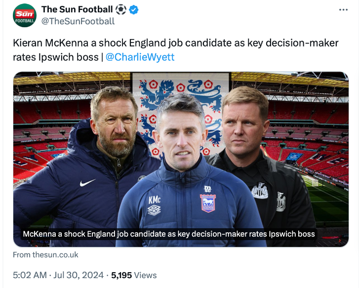 คีแรน แม็คเคนนา เฮดโค้ช อิปสวิช ทาวน์ น้องใหม่พรีเมียร์ลีก อังกฤษ กลายเป็นตัวเต็งลำดับต้นๆที่จะรับตำแหน่งผจก.ทีม สิงโตคำราม ซึ่งว่างอยู่เวลานี้ เหตุผลหลักๆเนื่องจากหนึ่งในผู้บริหารประทับใจฝีไม้ลายมือกุนซือหนุ่มมานาน