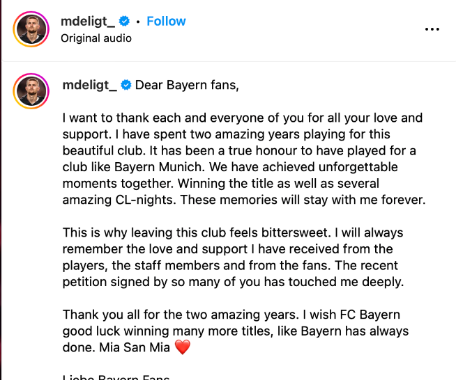 มัทไธส์ เดอ ลิกต์ ปราการหลังตัวใหม่ของ แมนฯ ยูไนเต็ด แม้ตัวจาก บาเยิร์น มิวนิค มาแล้วแต่ยังซาบซึ้งความรักของแฟนบอลที่เยอรมนี จึงใช้บัญชีอินสตาแกรมส่วนตัวเขียนจดหมายเปิดผนึกบอกลาอย่างเป็นกิจจะลักษณะ