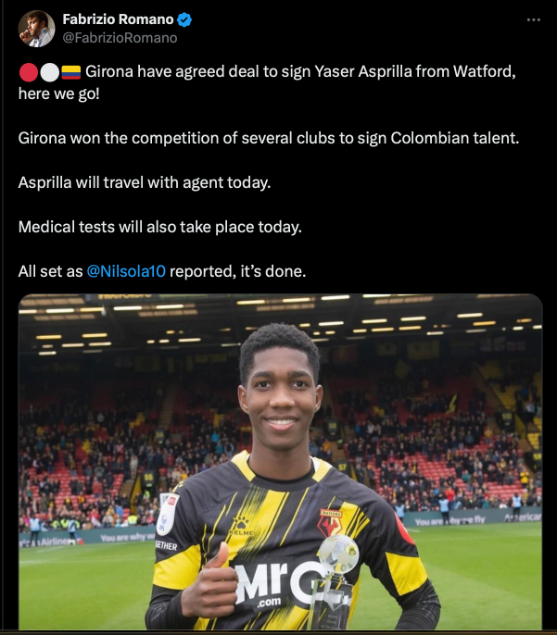สโมสร จีโรน่า แห่ง ลา ลีกา สเปน ได้ตัวแทน ซาวินโญ่ ปีกฟอร์มเด่นที่ขายไป แมนฯ ซิตี้ แล้ว นั่นคือ ยาเซอร์ อัสปริย่า แข้งหนุ่มจาก วัตฟอร์ด แห่งชปช.อังกฤษ