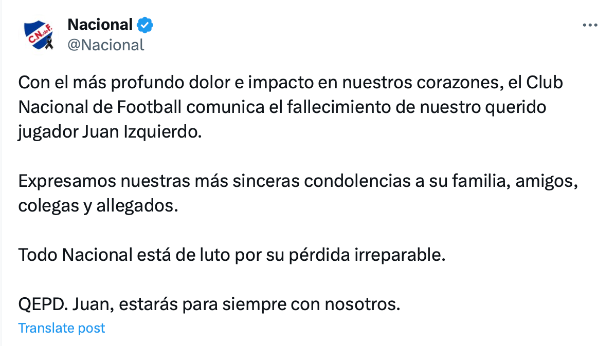 “ทั้งสโมสร นาซิอองนาล ต่างตกอยู่ใต้ความเศร้าโศกต่อการสูญเสียอย่างไม่สามารถหาอะไรมาทดแทนได้ของเขา”