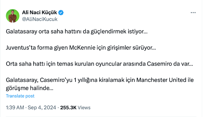 สโมสร กาลาตาซาราย แห่งซูเปอร์ลีก ตุรเคีย แสดงความจริงจังเพื่อขอเช่า-ยืม การ์ลอส กาเซมีโร่ กองกลาง แมนฯ ยูไนเต็ด ให้ทันเส้นตายตลาดขาเข้าของพวกเขาที่จะปิดในอีก 9 วันข้างหน้า หลังทราบว่าสถานการณ์ที่ โอลด์ แทร็ฟฟอร์ด ไม่ปกติ