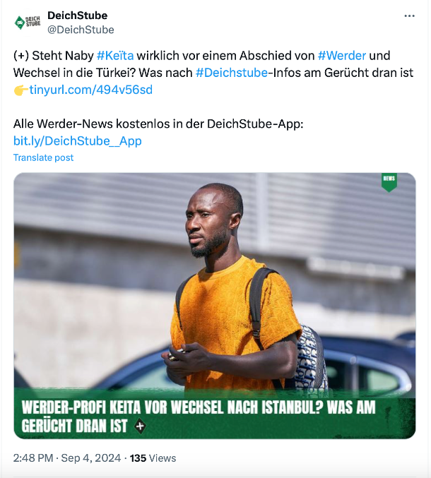 สโมสร อิสตันบูล บาชัคเชฮีร์ แห่งซูเปอร์ลีก ตุรเคีย จะตักตวงความได้เปรียบที่ลีกปิดตลาดขาเข้าช้ากว่าใคร เพื่อนำกองกลาง นาบี เกอิต้า จาก แวร์เดอร์ เบรเมน มาผนึกกำลังสำหรับเล่นหลายรายการ