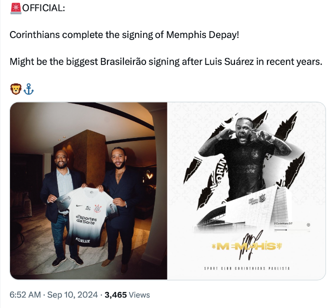 เมมฟิส เดอปาย กองหน้าดีกรีทีมชาติเนเธอร์แลนด์ เปิดประสบการณ์ใหม่ยัง ซีรี่ส์ เอ บราซิล เมื่อใช้สถานะฟรีเอเยนต์เซ็นร่วมงาน โครินเธียนส์ เป้าหมายช่วยต้นสังกัดใหม่หนีตาย ตามแถลงการณ์ผ่านบัญชีเอ็กซ์