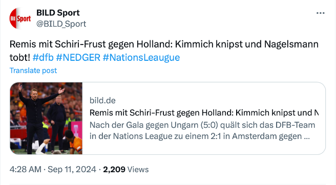 รายงานจาก ‘สปอร์ต บิลด์’ ว่าสี่ผู้เล่นซึ่งรับใหญ่ ‘อินทรีเหล็ก’ อย่างยาวนานแล้วแจ้งรีไทร์หลังสิ้นทัวร์นาเมนต์ ยูโร 2024 ประกอบด้วย โทนี่ โครส, โธมัส มุลเลอร์, อิลคาย กุนโดอาน และ มานูเอล นอยเออร์ ซึ่งจำนวนเกมรับใช้ชาติรวมกัน 451 นัด