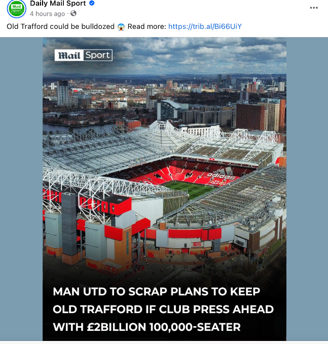 สโมสร แมนฯ ยูไนเต็ด มีแผนรื้อถอนสนามเหย้า โอลด์ แทร็ฟฟอร์ด หากสามารถผ่านอนุมัติงบประมาณก่อสร้างรังเหย้าใหม่มูลค่า 2,000 ล้านปอนด์ นับเป็นการเปลี่ยนแผนจากเดิมจะเก็บสเตเดี้ยมเก่าแก่ให้ทีมสตรี-ทีมเยาวชนเตะ