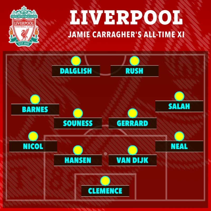 ลิเวอร์พูล ดีที่สุดตลอดกาลของ คาร์ราเกอร์ ในระบบ 4-4-2 : เรย์ คลีเมนซ์ - ฟิล นีล, เฟอร์จิล ฟาน ไดค์, อลัน แฮนเซ่น, สตีฟ นิโคล - โมฮาเหม็ด ซาลาห์, แกรม ซูเนสส์, สตีเว่น เจอร์ราร์ด, จอห์น บาร์นส์ - เคนนี่ ดัลกลิช, เอียน รัช