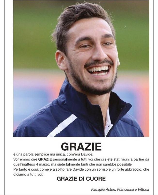 ครอบครัวของ ดาวิเด้ อัสตอรี่ พร้อมด้วยแฟนสาว ลงทุนซือหน้าหนังสือพิมพ์รายวันในอิตาลี ทำการขอบคุณผู้มีส่วนร่วมทุกฝ่าย รวมถึงกำลังใจจากญาติมิตร, สโมสร และแฟนบอล หลังการเสียชีวิตของกัปตันทีม ฟิออเรนติน่า