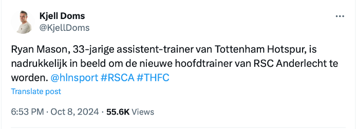ไรอัน เมสัน อดีตกองกลาง, รักษาการเฮดโค้ช ท็อตแน่ม ฮอตสเปอร์ อยู่ในข่ายพิจารณาเพื่อรับตำแหน่งหัวหน้าผู้ฝึกสอน อันเดอร์เลชท์ ทีมในจูปิแลร์ลีก เบลเยียม