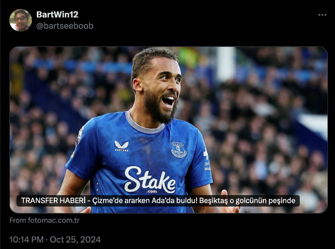 โดมินิค คัลเวิร์ต-ลูวิน กองหน้า เอฟเวอร์ตัน อาจออกไปหาความท้าทายใหม่กับ เบซิคตัส แห่งซูเปอร์ลีก ตุรเคีย แบบยืมตัวตลาดมกราคม 2025 หากไม่ได้รับการต่อสัญญาเพิ่ม