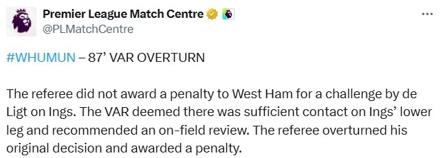 พรีเมียร์ลีก ชี้แจงผ่าน "Premier League Match Centre" ทางแพลตฟอร์ม X หรือทวิตเตอร์ว่า "ผู้ตัดสินไม่ได้ให้จุดโทษกับ เวสต์แฮม ในจังหวะที่เดอ ลิกต์เข้าปะทะกับแดนนี่ อิงส์"
