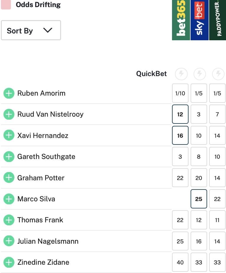 รูเบน อาโมริม เฮดโค้ช สปอร์ติ้ง ลิสบอน กลายเป็นเต็มหามที่จะเข้ารับตำแหน่งหัวผู้ฝึกสอน แมนฯ ยูไนเต็ด คนใหม่ในสายตา สกาย เบต บ่อนรับพนันถูกกฎหมายเรตแค่ 5/1 (แทง 1 จ่าย 5 ไม่รวมทุน) ส่วนคนอื่นจ่ายมากกว่าทุนทั้งสิ้น
