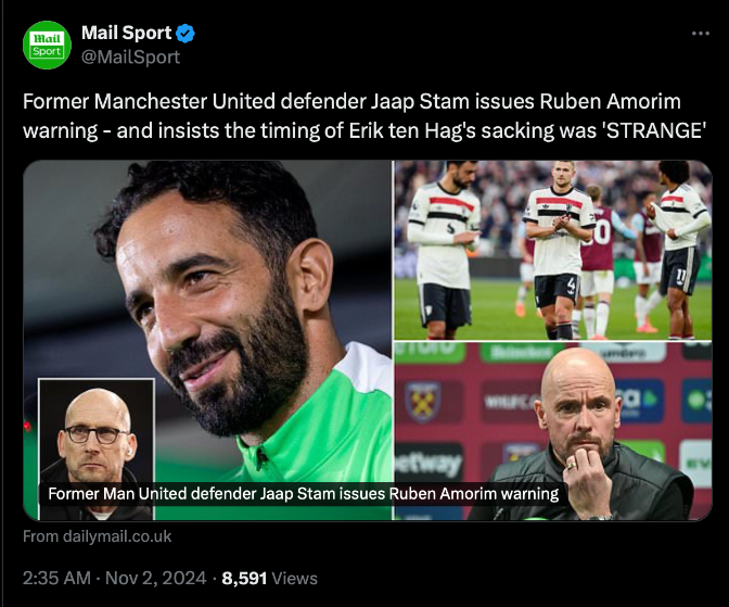 ยูไนเต็ด เพิ่งแถลงการณ์จองตัว อาโมริม วัย 39 ปีจาก สปอร์ติ้ง ลิสบอน เซ็นสัญญาถึง มิ.ย. 2027 แบบมีออปชั่นทีมขยายเพิ่มอีก 1 ปี โดยจะมารับตำแหน่งทางการ 11 พ.ย.นี้