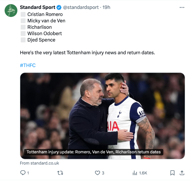 รายงานจาก ‘สแตนดาร์ด สปอร์ต’ ว่าสถานการณ์ผู้เล่นบาดเจ็บของ สเปอร์ส รังแต่แย่ลงๆ อย่างเกมล่าสุดที่เอาชนะ แอสตัน วิลล่า 4-1 ก็สังเวยปราการหลัง คริสเตียน โรเมโร่ และกองหน้า ริชาร์ลิซอน เพิ่มอีก