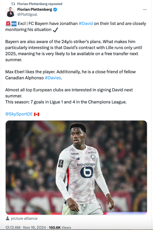 สโมสร บาเยิร์น มิวนิค เป็นทีมล่าสุดที่แสดงความสนใจพร้อมประมูลค่าจ้างให้ โจนาธาน ดาวิด กองหน้า ลีลล์ ซึ่งจะหมดสัญญามิ.ย. 2025