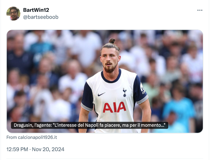 โฟลริน มาเนีย เอเยนต์ส่วนตัวของปราการหลัง ราดู ดรากูชิน แห่ง ท็อตแน่ม ฮอตสเปอร์ มองว่าเป็นไปได้ยากที่ต้นสังกัดจะปล่อยย้ายออกตลาดมกราคม 2025 ดังนั้นนักเตะต้องพยายามเบียดชิงตำแหน่งตลอดซีซั่นนี้ก่อน หากไร้ทิศทางบวกไว้รอบกลางปีหน้าว่ากัน