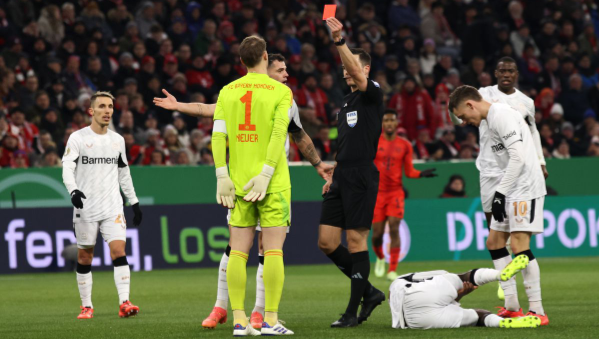 นอยเออร์ ได้ใบแดงในจังหวะออกมาตัดบอลหน้าเขตโทษแต่ไม่ได้บอล และกลายเป็นว่าวิ่งชนใส่ เฌเรมี่ ฟริมปง วิงแบ็กของ เลเวอร์คูเซ่น ในเกมเดเอฟเบ โพคาล รอบ 16 ทีมที่ "ห้างยา" เป็นฝ่ายบุกชนะ 1-0 เข้ารอบต่อไปได้