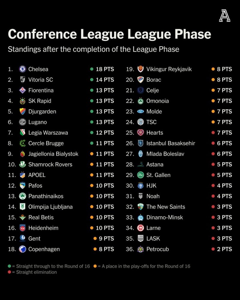 การแข่งขันยูโรปา คอนเฟอเรนซ์ ลีก รอบลีกเฟส นัดที่ 6 จบลงไปเมื่อวันพฤหัสบดีที่ 19 ธันวาคมที่ผ่านมา ทำให้ได้ 8 ทีมแรกผ่านเข้ารอบ 16 ทีมโดยอัตโนมัติ