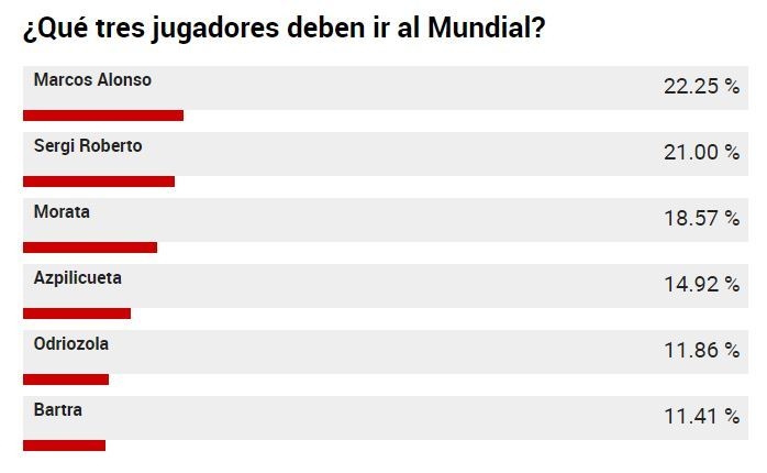มาร์ก้า สำรวจความคิดเห็นแฟนบอลซึ่งมีผู้ร่วมแสดงความเห็นเกือบ 1 แสนคนมีเสียงหนุนให้ จูเลน โลเปเตกี เลือก มาร์กอส อลอนโซ่, เซร์จี้ โรเบร์โต้ กับ อัลบาโร่ โมราต้า ติดโผกระทิงลุยฟุตบอลโลกรอบสุดท้ายเหนือกว่า เซซ่าร์ อัซปิลิกวยต้า, อัลบาโร โอดรีโอโซล่า กับ มาร์ก บาร์ตร้า