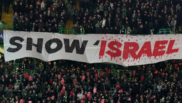 แฟนบอลเซลติกหลายร้อยคนชูกระดาษสีแดงไว้บนที่นั่งด้านล่างซึ่งมีแบนเนอร์ซึ่งเขียนว่า "ชูใบแดงให้อิสราเอล"
