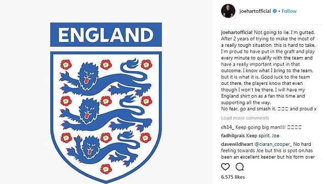 โจ ฮาร์ท นายด่านมากประสบการณ์ชาวอังกฤษ ออกมาแสดงความรู้สึกเป็นครั้งแรกหลังจากไม่มีชื่อเป็น 23 ขุนพล 'สิงโตคำราม' ชุดสู้ศึกเวิลด์ คัพ 2018 รอบสุดท้ายว่าเสียใจอย่างมาก แต่ก็ยังแมนพออวยพรให้ประสบความสำเร็จ
