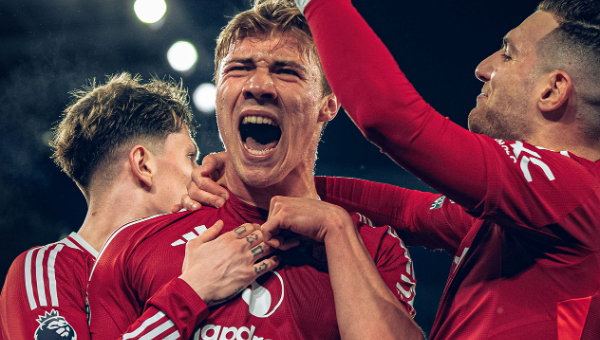 ราสมุส ฮอยลุนด์ กองหน้า แมนเชสเตอร์ ยูไนเต็ด เป่าปากโล่งทำประตูให้ทีมได้อีกครั้งในเกมบุกชนะ เลสเตอร์ ซิตี้